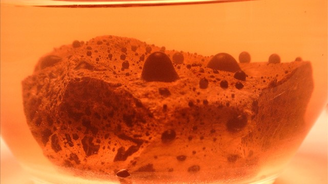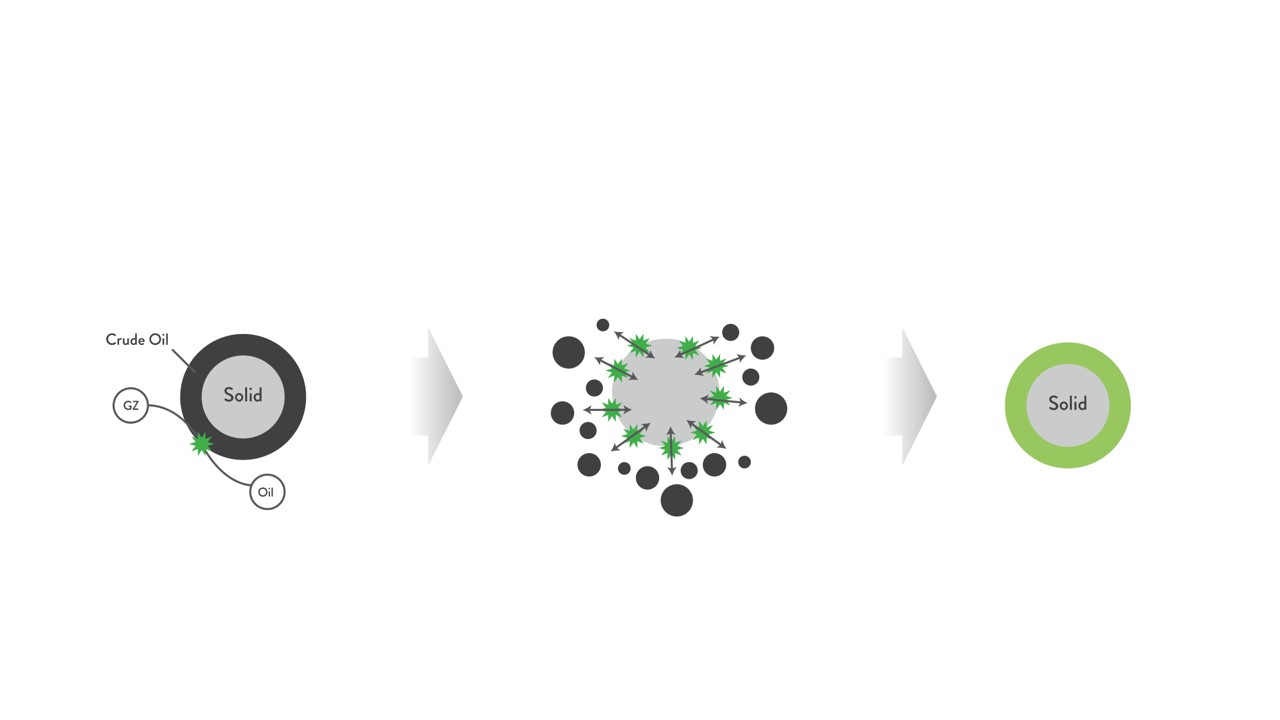 As AlphaZyme reaches the oil / sand mixture, oil immediately releases from the substrate. Gravity then does its job; the pure oil separates and floats to surface while sediment is left behind on the surface floor.